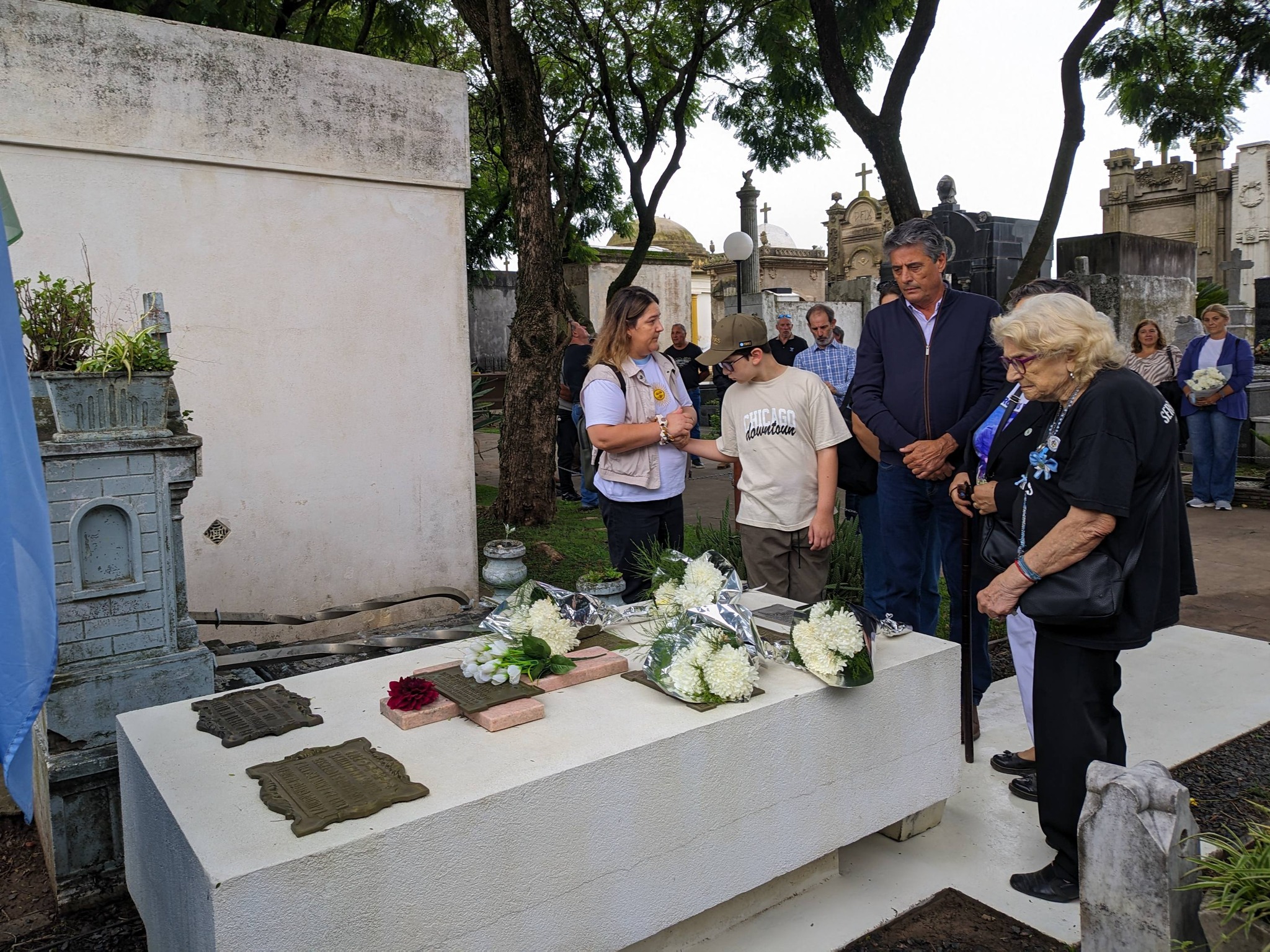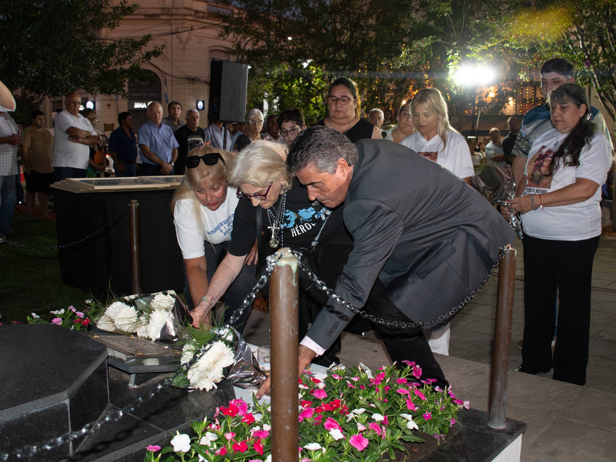 ■ En un momento de profundo valor simbólico, Etcheverry, Beba Azárate y familiares de los cuatro lobenses caídos en combate depositaron ofrendas florales. Luego se sumaron instituciones educativas y representantes de la Biblioteca Héroes de Malvinas.